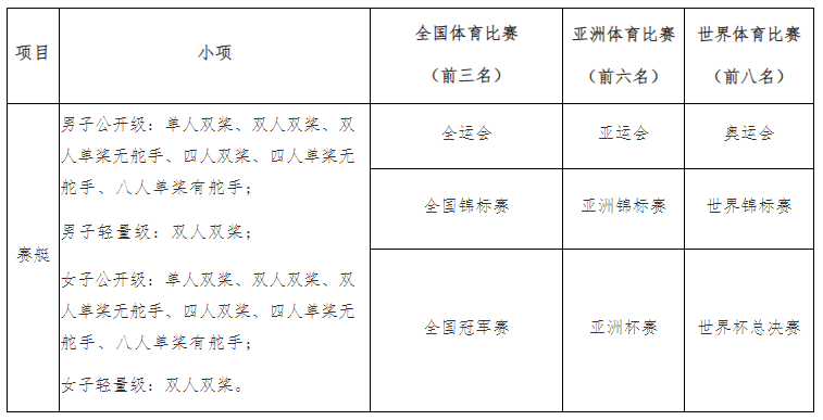 ④赛艇项目被授予运动健将称号,且参加下表中所列赛事和小项的最高组别比赛,且取得世界体育比赛前八名,或亚洲体育比赛前六名,或全国体育比赛前三名。
